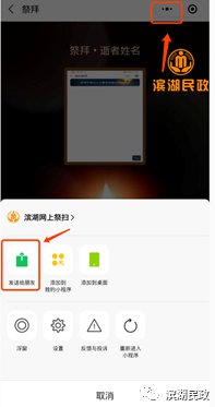 03、点击祠堂页面右上角三点按钮,即可将祠堂分享给微信朋友,即可加入其他人共同祭拜(通过分享的祠堂不计入祠堂创建的个数限制)。