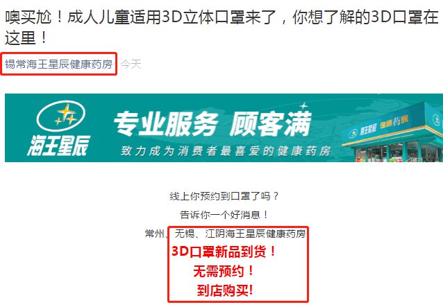无锡、江阴海王星辰健康药房3D口罩新品到货!无需预约!到店购买!