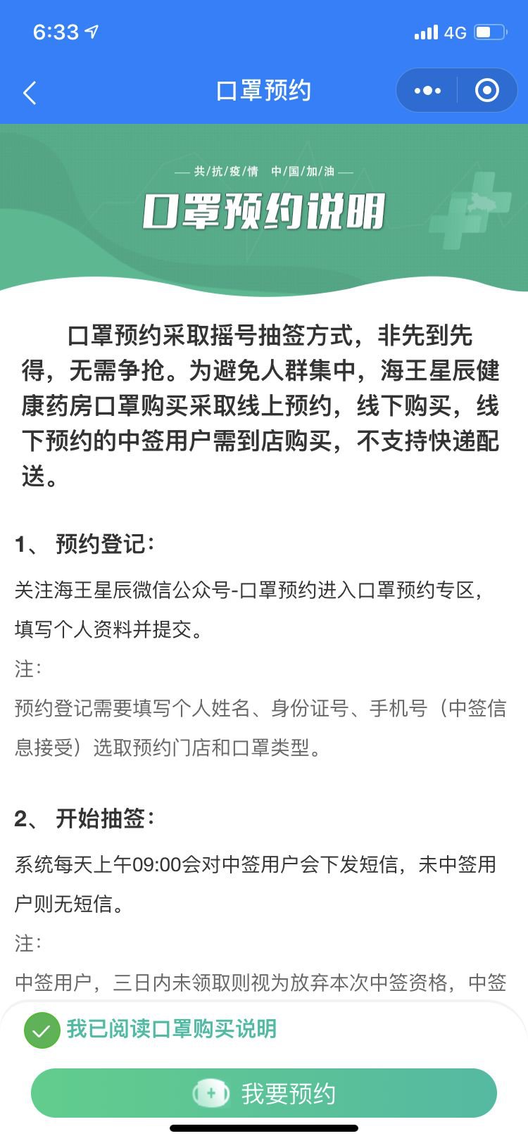 4、查看口罩预约说明,拉至最下方选择【我已阅读口罩购买说明】,然后点击【我要预约】