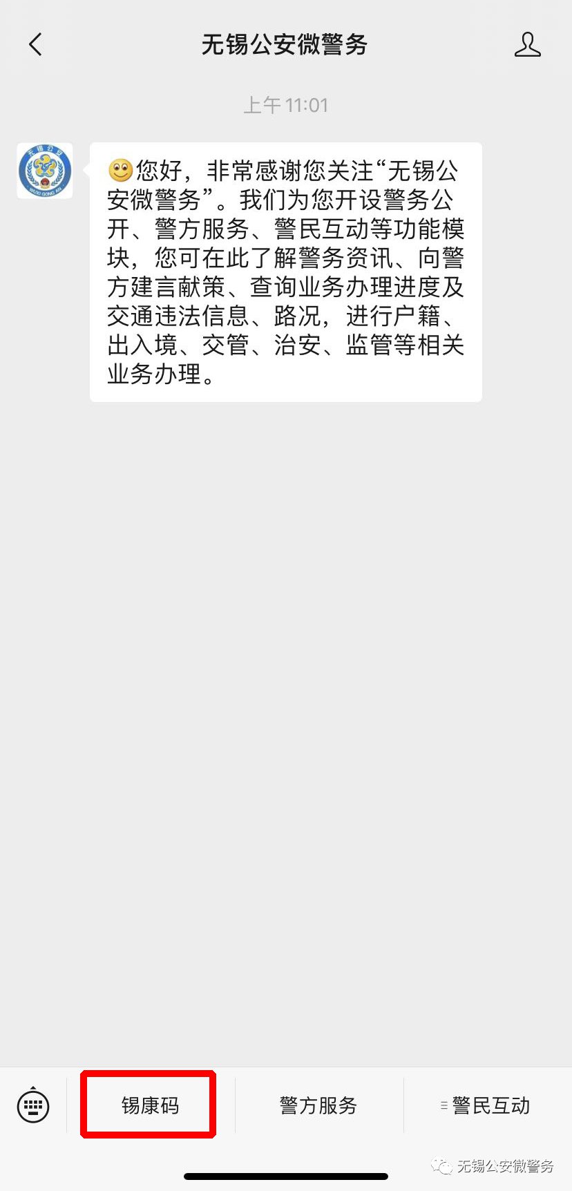 一、关注“无锡公安微警务”官方微信公众号,点击底部菜单栏“锡康码”图标,进入“锡康码”公共服务平台,点击【委托申报】