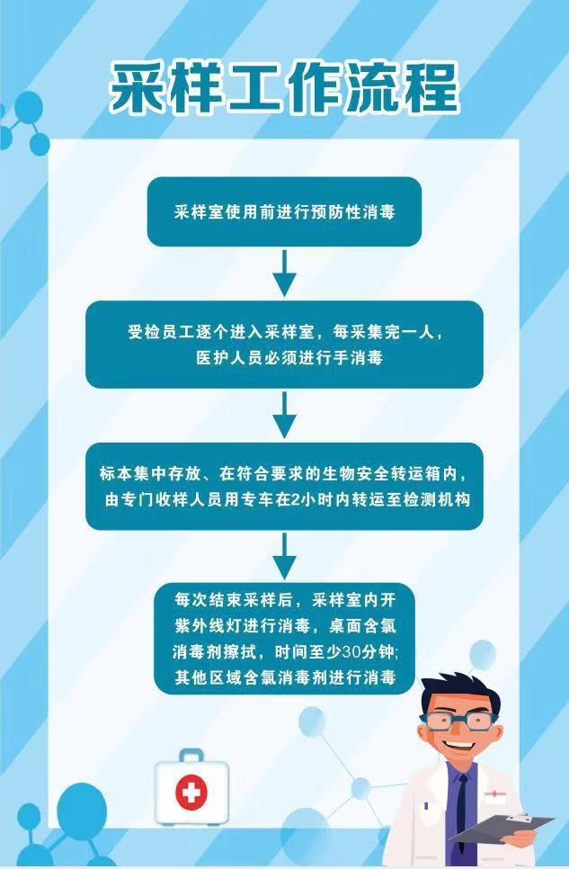 采样点:采样点利用空置场地,远离居民区;采样人员严格二级防护,隔离潜在威胁;工作人员和采样对象通道分开。