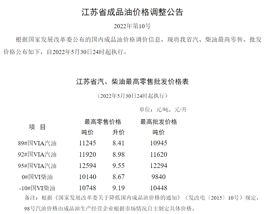 根据国家发展改革委公布的国内成品油价格调价信息,现将我省汽、柴油最高零售、批发价格公布如下,自2022年5月30日24时起执行。