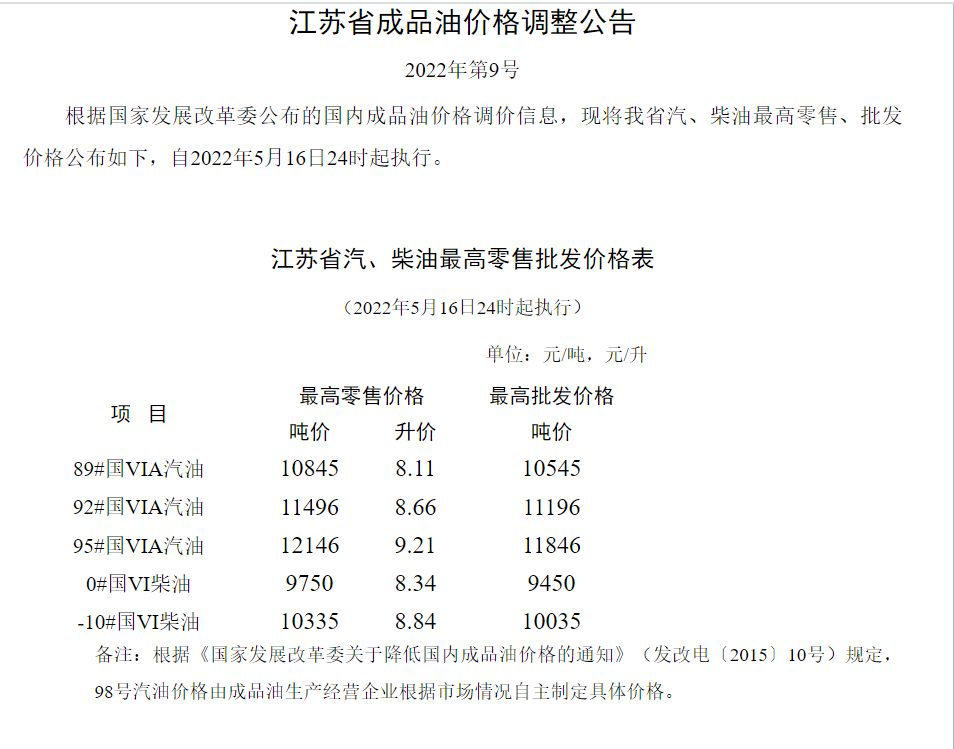 根据国家发展改革委公布的国内成品油价格调价信息,现将我省汽、柴油最高零售、批发价格公布如下,自2022年5月16日24时起执行。