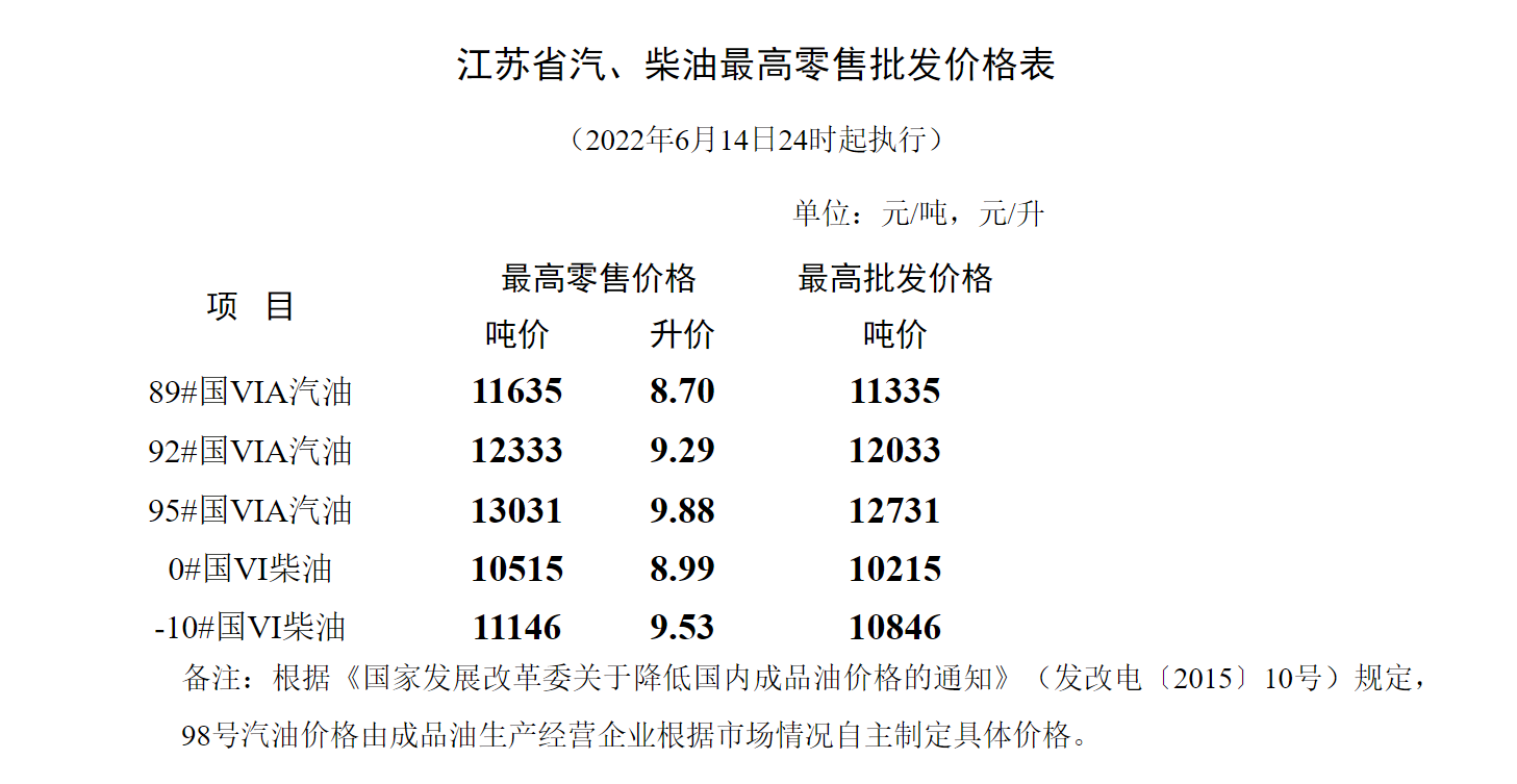 根据国家发展改革委公布的国内成品油价格调价信息,现将我省汽、柴油最高零售、批发价格公布如下,自2022年6月14日24时起执行。