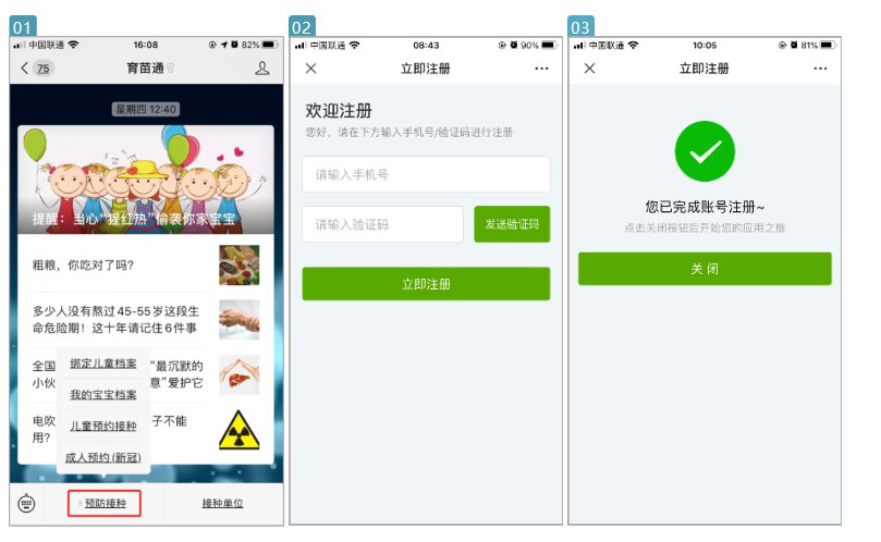 1.首先初次使用育苗通公众号,需要先完成注册,微信界面——预防接种,任一菜单都提示如图注册即可。
