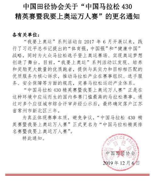 “中国马拉松430精英赛暨我要上奥运万人赛”,2019年12月6日正式更名啦,改为“中国马拉松精英排名赛暨我要上奥运万人赛”,查询时要注意别搜索错名称啦