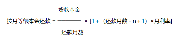 等额本金还款方式又称为利随本清还款方式,即利息随着每月贷款本金的偿还而结清,已偿还的本金不再参与下次利息的计算,计算公式如下: