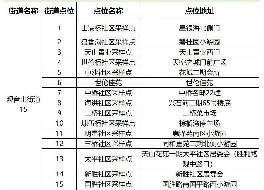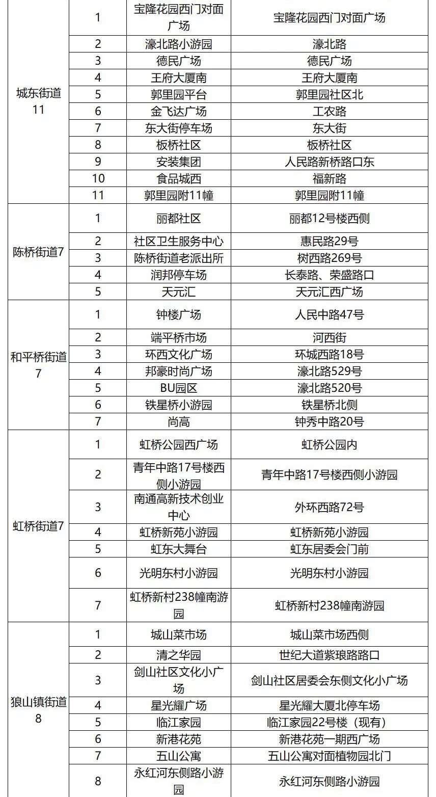 包括环西文化广场便民核酸采样点、唐闸镇街道长岸社区的万象城便民核酸采样点、秦灶街道桥北社区的便民采样点、狼山镇街道城山路菜市场便民核酸采样点、崇川经济开发区便民核酸采样点、幸福街道秦西社区商务中心便民采样核酸点、南川园社区圆融广场便民核酸采样点……