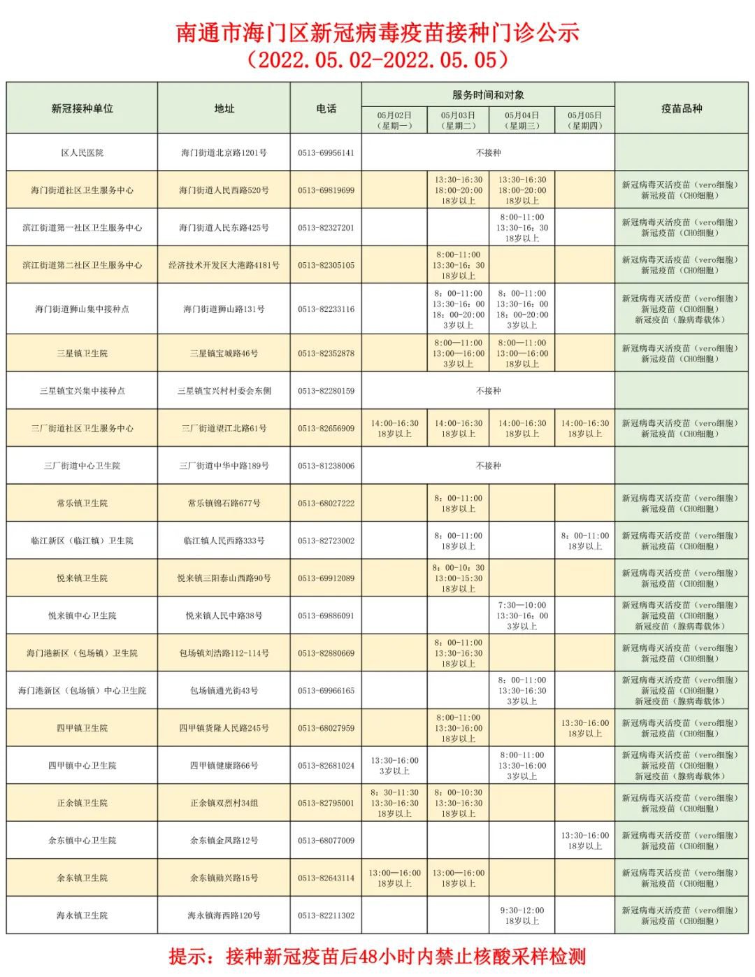 注:5月2日-5月5日海门区各新冠疫苗接种单位接种时间如图,仅供参考,如有变动请以实际为准。