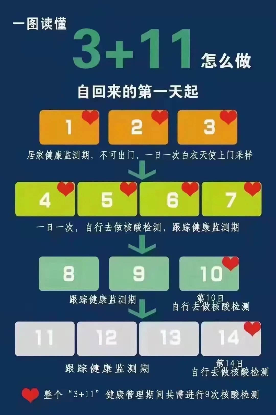 “3+11”政策不涉及集中隔离,但前3天居家健康监测期间需严格居家,进行核酸检测并报告体温等身体状况。后11天如需外出也请规范佩戴口罩,做好自我防护,并积极配合后续核酸检测要求。
