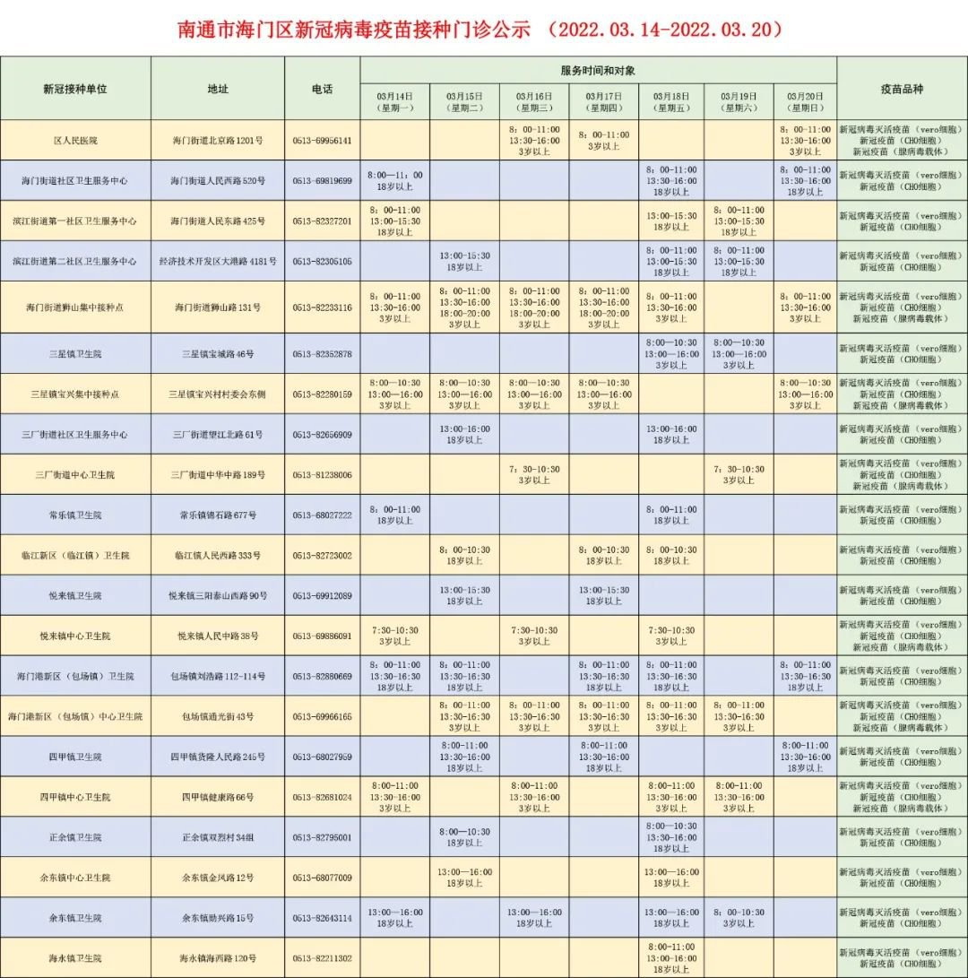 注:3月14日-3月20日海门区各新冠疫苗接种单位接种时间如图,后续开诊时间如有调整,另行通知。