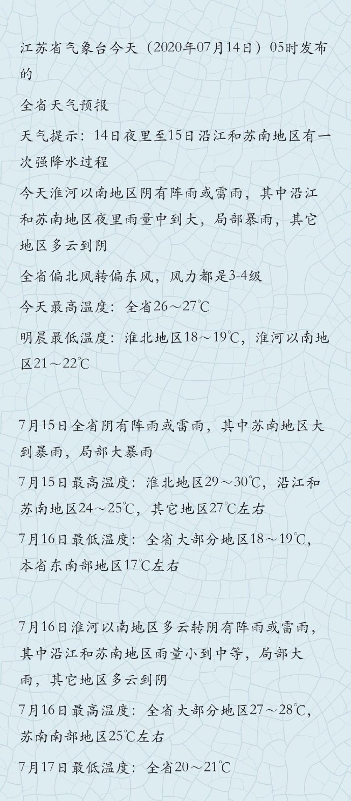 【14日夜里至15日沿江和苏南地区有一次强降水过程】今天淮河以南地区阴有阵雨或雷雨,其中沿江和苏南地区夜里雨量中到大,局部暴雨,其它地区多云到阴,全省偏北风转偏东风,风力都是3-4级,今天最高温度:全省26~27℃,明晨最低温度:淮北地区18~19℃,淮河以南地区21~22℃。