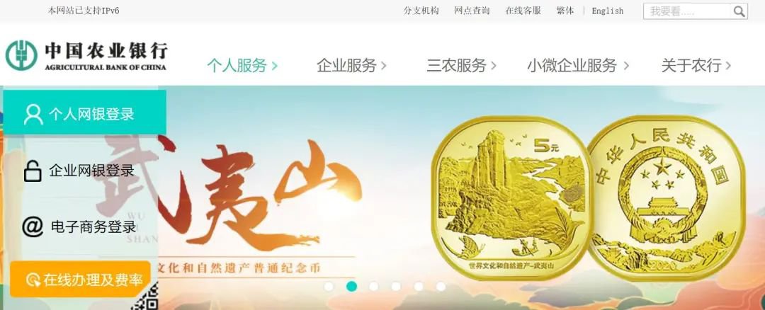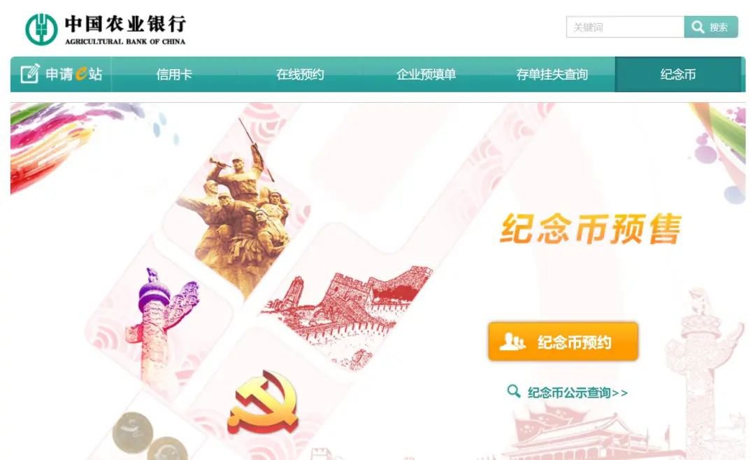 1、登陆中国农业银行官网(http://www.abchina.com/cn/),点击首页广告图,进入纪念币预约首页