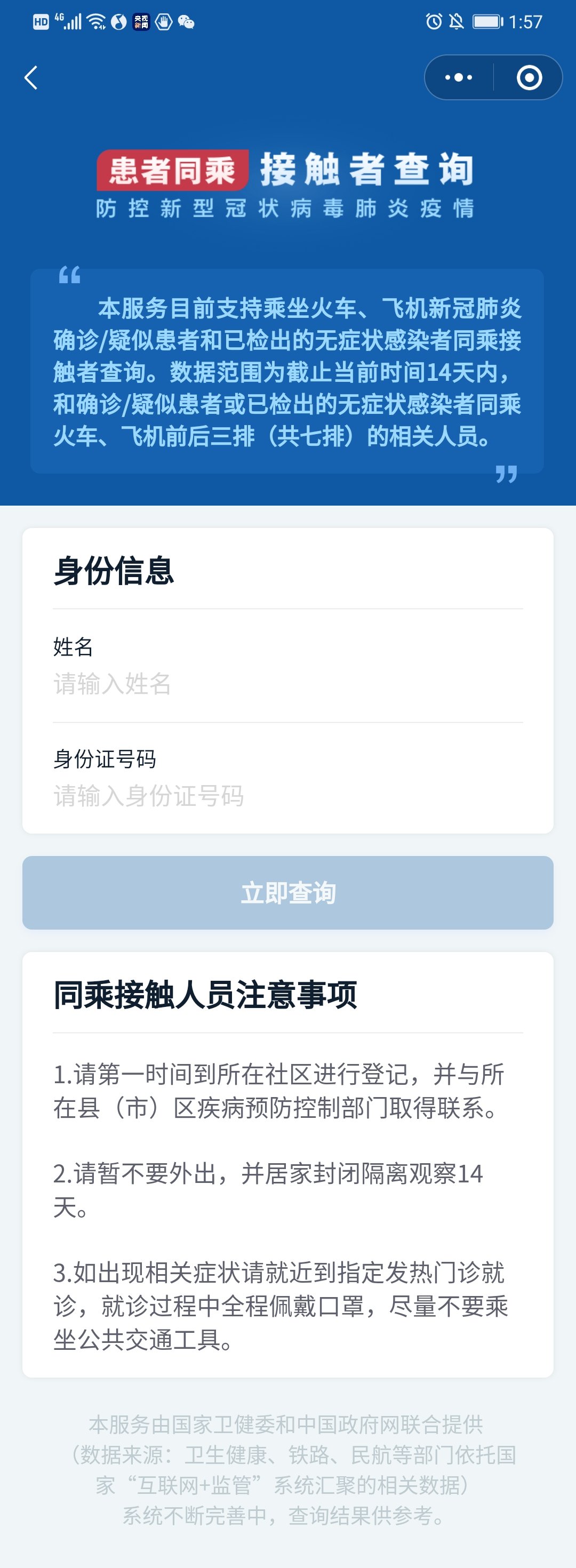 注:本查询所指患者同乘接触者,范围为截止当前时间的14天内,和确诊/疑似患者或已检出的无症状感染者同乘火车、飞机前后三排(共七排)的相关人员,不排除其他途径与确诊/疑似患者或无症状感染者接触的可能性,建议关注身体情况并做好防护,如出现相关症状请就近到指定发热门诊就诊。