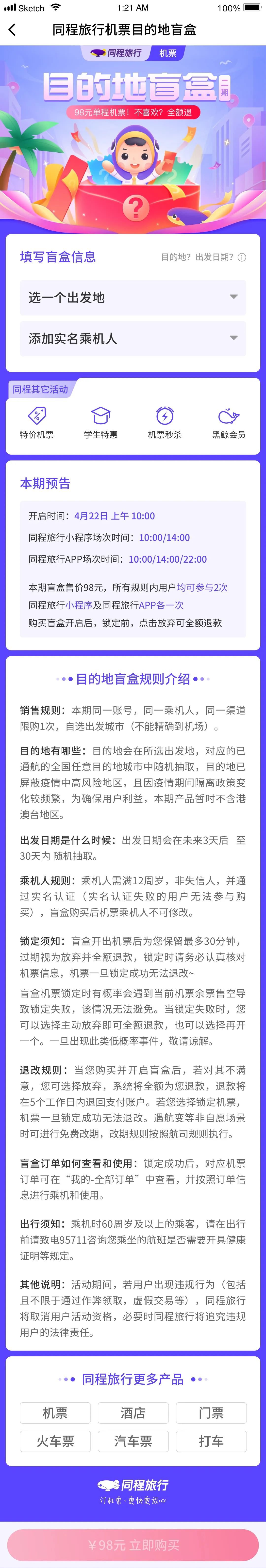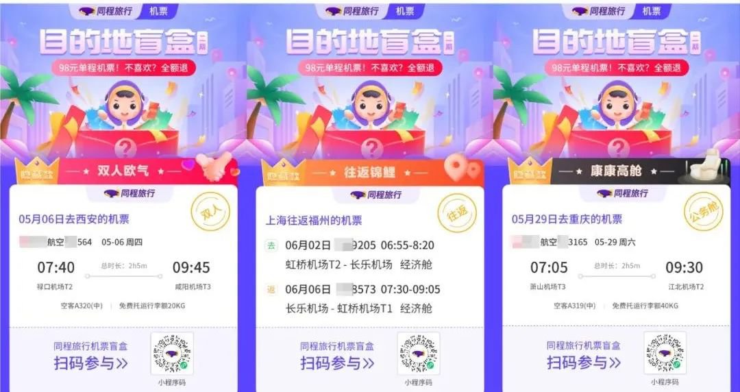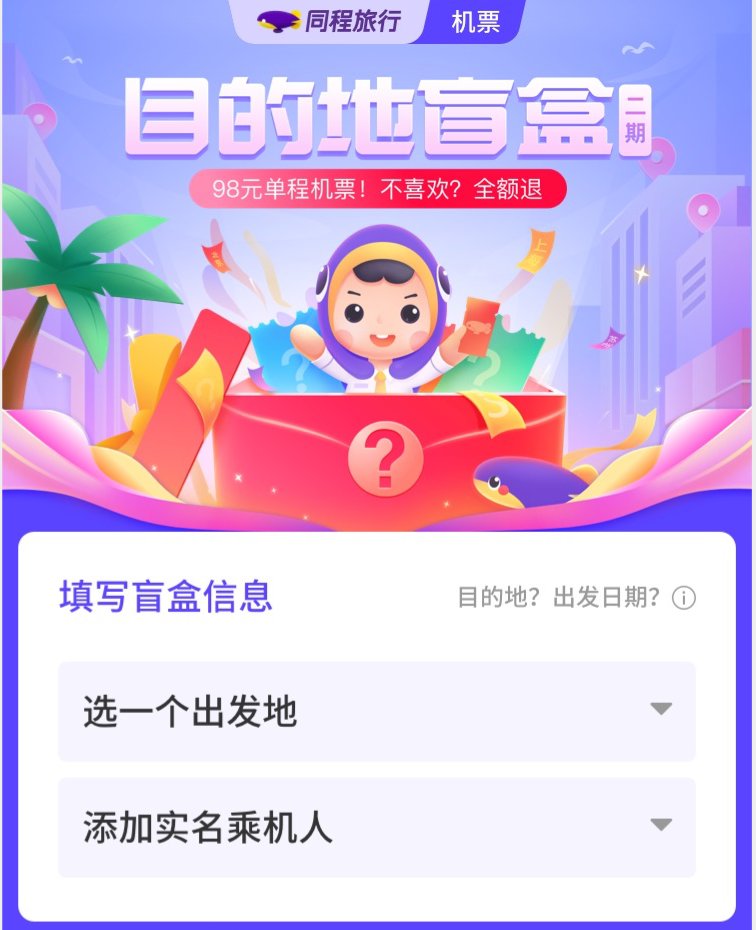 98元(含机建燃油)购买一个机票盲盒不需要助力,直接抢付款成功后,100%得到一张,3-30天内出发的机票机票出发地可选择,目的地随机出行时间覆盖五一假期,还有双人/往返/公务舱的隐藏款!不喜欢?全额退!小程序、同程旅行APP各开一次盲盒。包括上一期购买过的用户,所有人2次机会、加倍快乐!