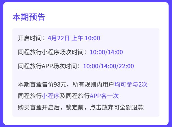 本期盲盒所有人有两次购买机会,可以开两次盲盒!小程序买一次、同程旅行APP再买一次。第一期参与过活动的用户,不管是成功出行还是未锁定退款的,本期都有机会参与。