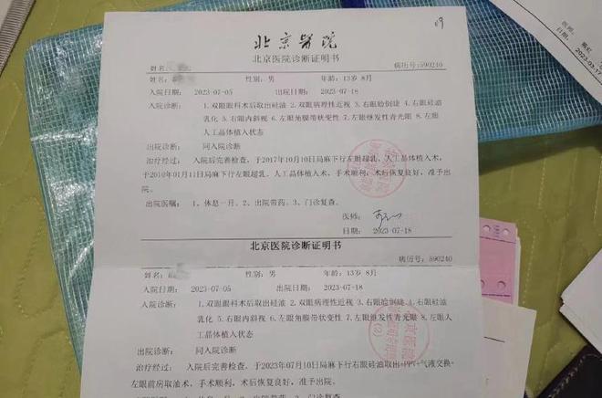 “第二天,弟弟就说左眼已经彻底看不清东西了,右眼看东西也十分模糊,我们一家人就带孩子去北京一家医院看病。”根据胡女士提供的北京医院诊断证明书显示,患者外伤后右眼视力下降2天,诊断为:右眼视网膜脱离,右眼继发性青光眼,右眼玻璃体积血。左眼视网膜脱离玻璃体切除术后,根据术后诊断证明,胡女士弟弟右眼视力为0.12,左眼则完全失明。