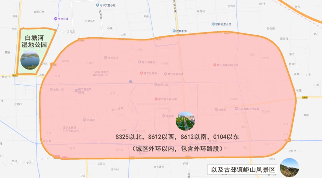 根据具体情况划定区域【S325以北,S612以西,S612以南,G104以东(城区外环以内,包含外环路段)、白塘河湿地公园、岠山风景区】为禁止燃放烟花爆竹区域;禁放区域以外的城区为限制燃放烟花爆竹区域。