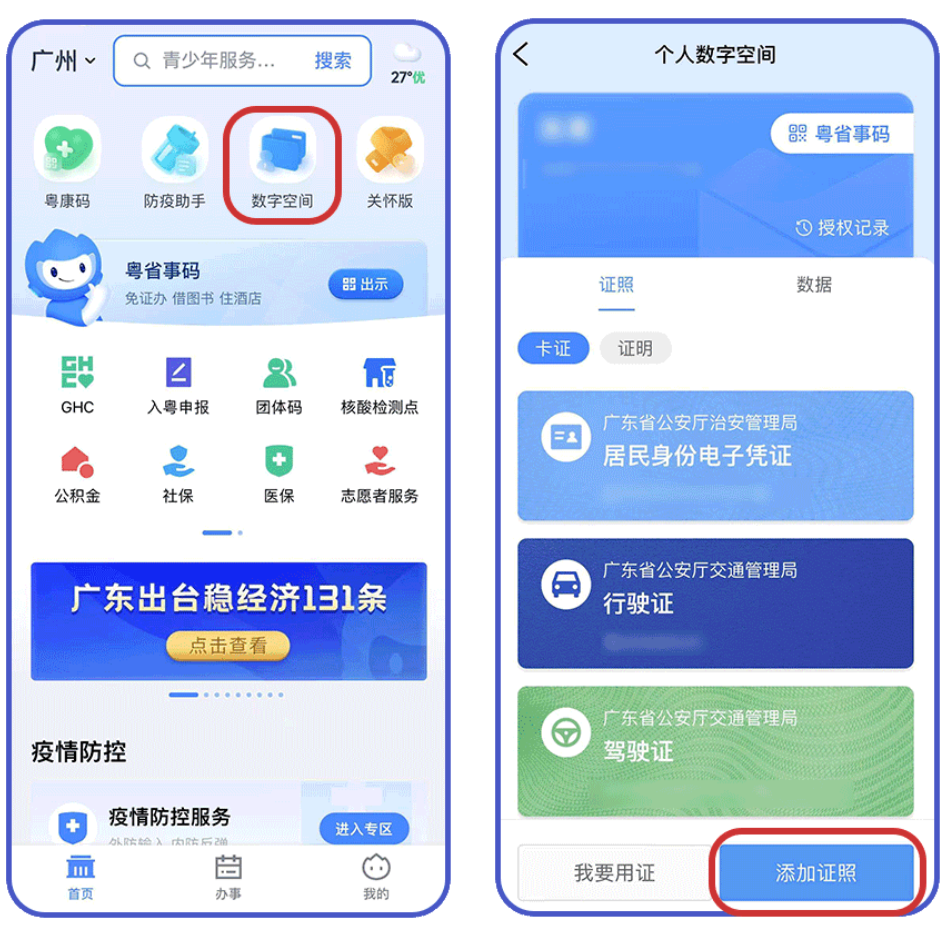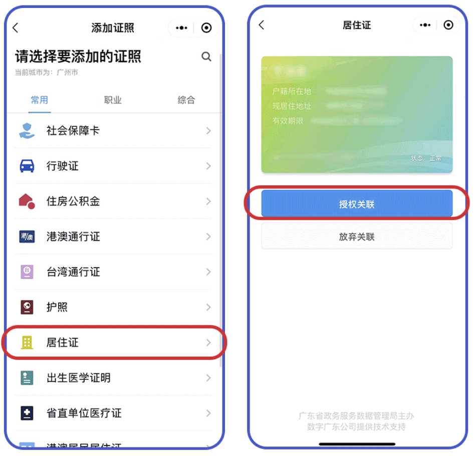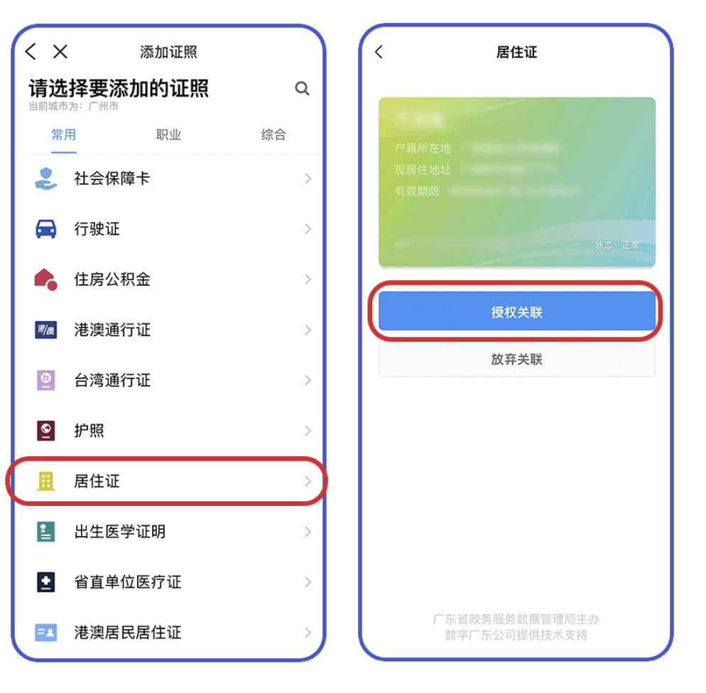 方式一:进入“粤省事”APP,点击“数字空间”-“添加证照”-“居住证”,根据页面提示完成关联。