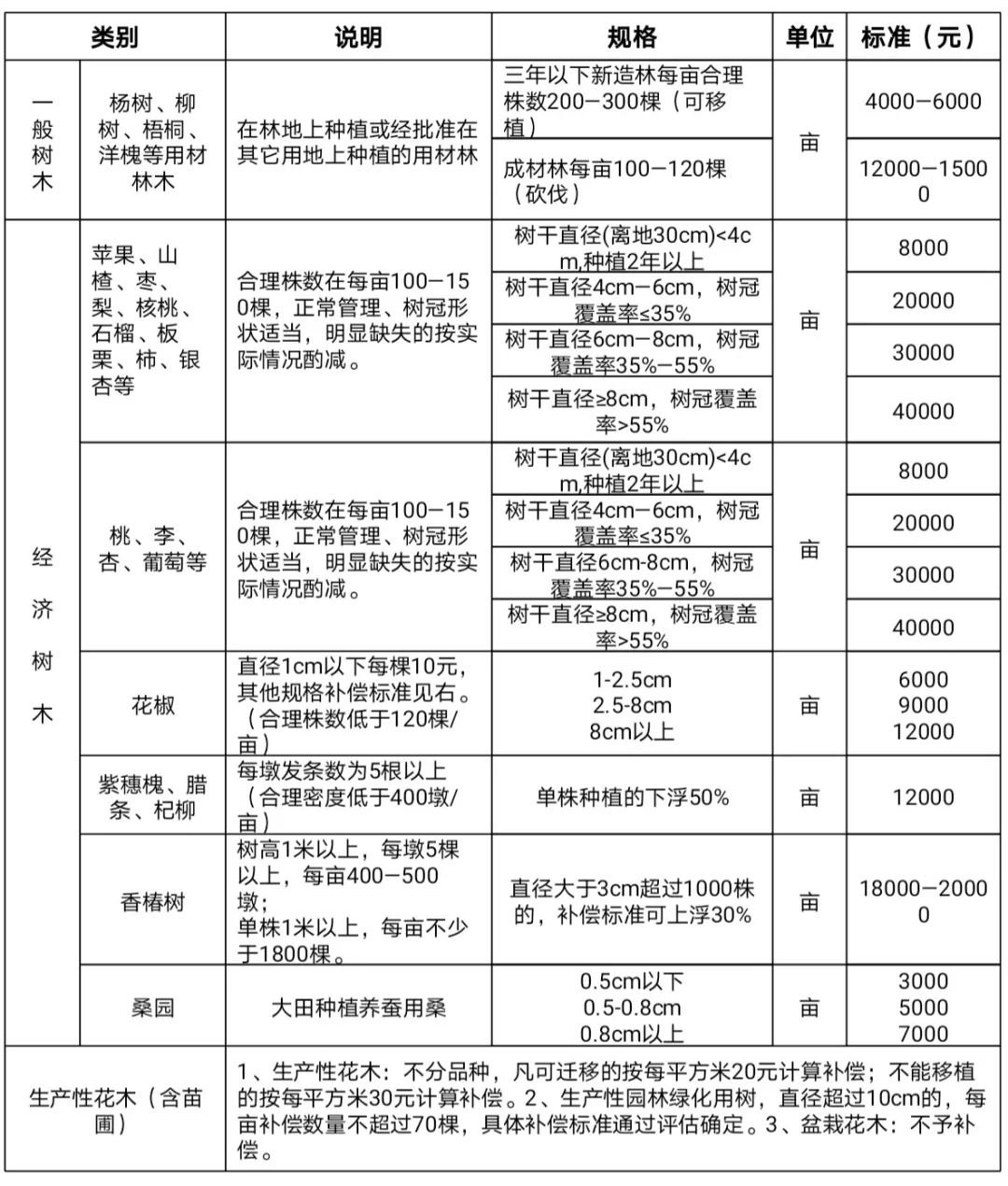 (一)树木和花木补偿标准