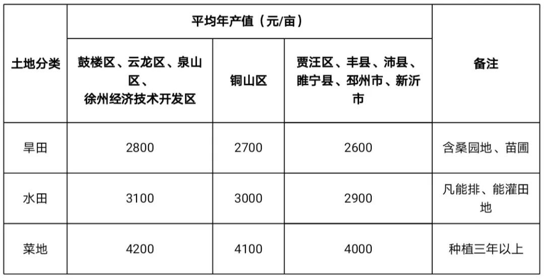 贾汪区、丰县、沛县、睢宁县、邳州市和新沂市分别将本辖区整体划定为一个区片,执行标准为综合地价46000元/亩,其中土地补偿费26000元/亩,安置补助费20000元/人。以上土地补偿费为征收旱地的价格,如征收涉及水田和菜地,每亩分别提高3000元和14000元。