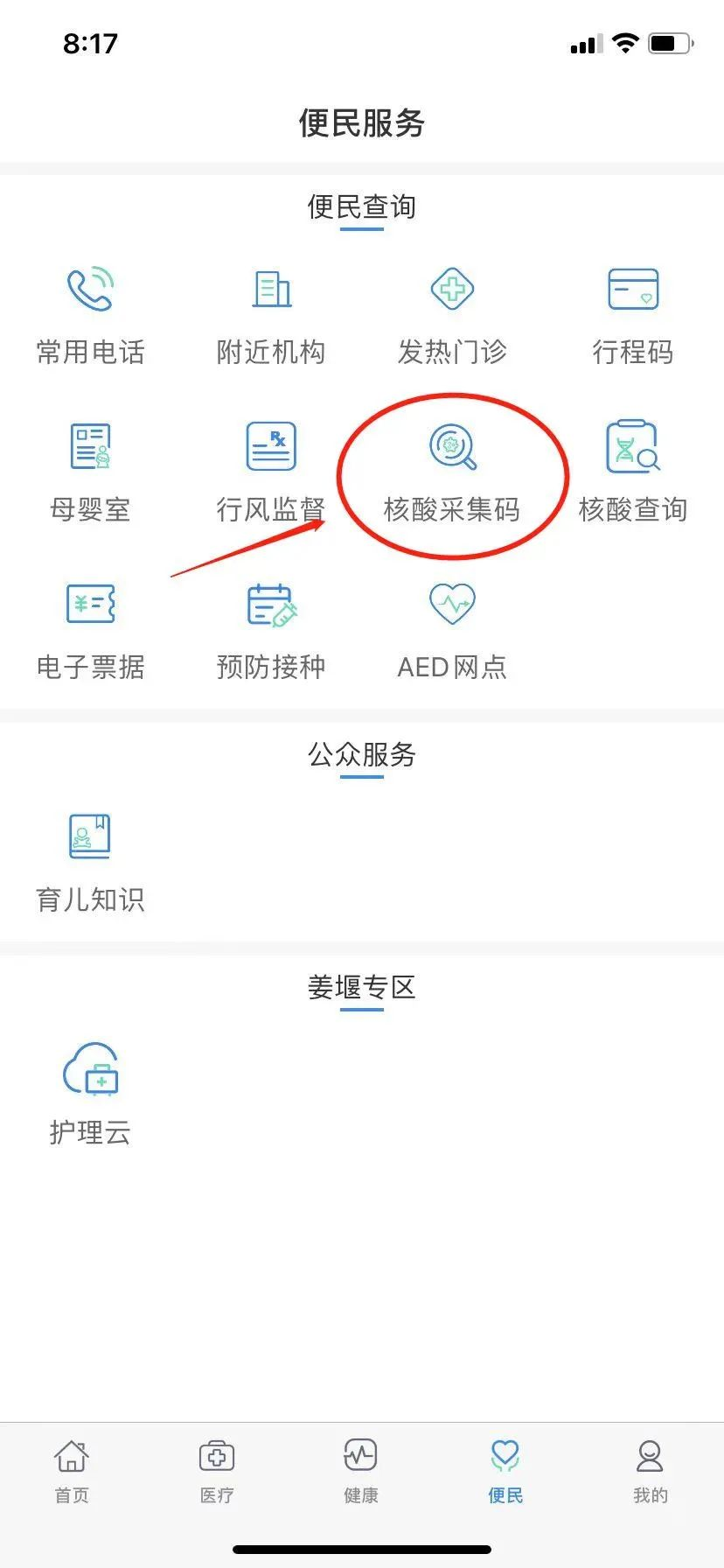 2、登录成功后,点击“便民”→“核酸采集码”