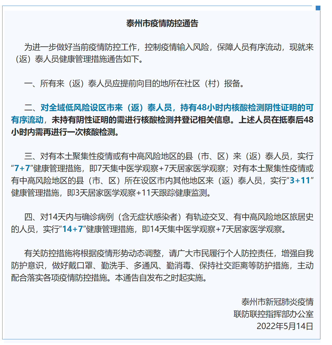 温馨提示:所有来泰人员须持48小时内核酸检测阴性证明,在抵泰1天前向目的地单位、社区(村)、酒店等报备。建议各位省外来泰人员提前打电话向村(社区)进行咨询。