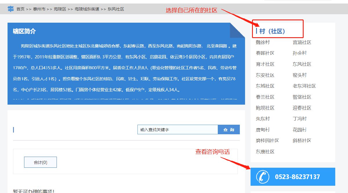 例如:江苏省——泰州市——海陵区——城东街道——东风社区——查看咨询电话