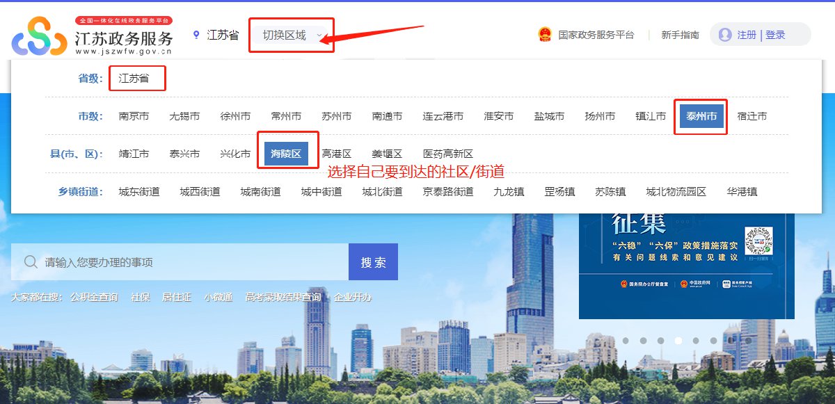 第一步:点击进入首页,在“切换区域”中选择“泰州市”——到达的县市区——自己要到达的乡镇街道。