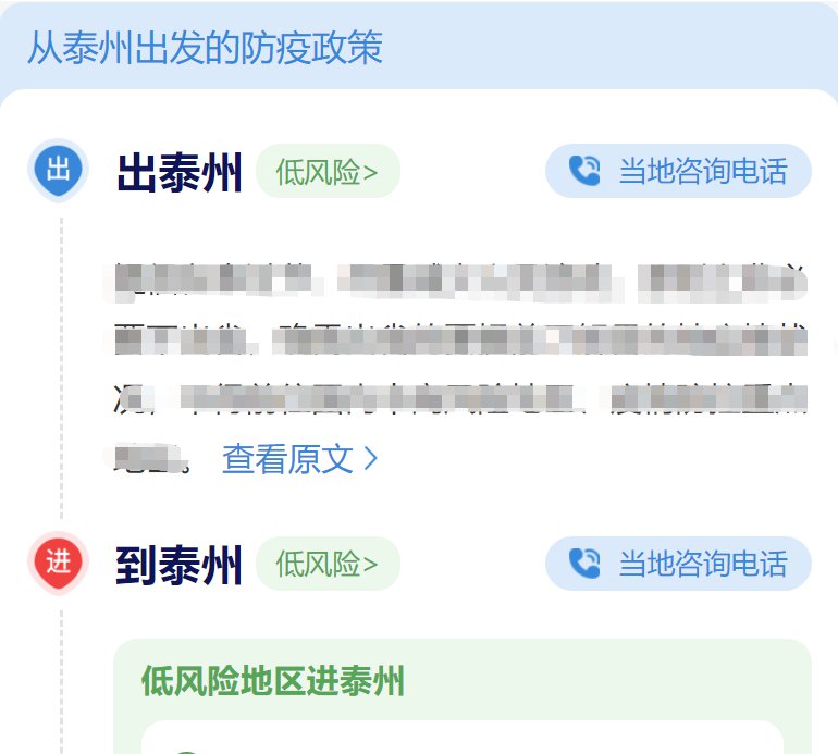 点击进入后,同样可以选择目的地和所在地,下拉滑动可以查看出泰州和到泰州的详细规定(由于这个疫情防控是动态变化的,截图内容就不展示啦),到泰州还会分地区划分(低风险地区/中风险地区/高风险地区)相关隔离和核酸检测规定,非常方便!