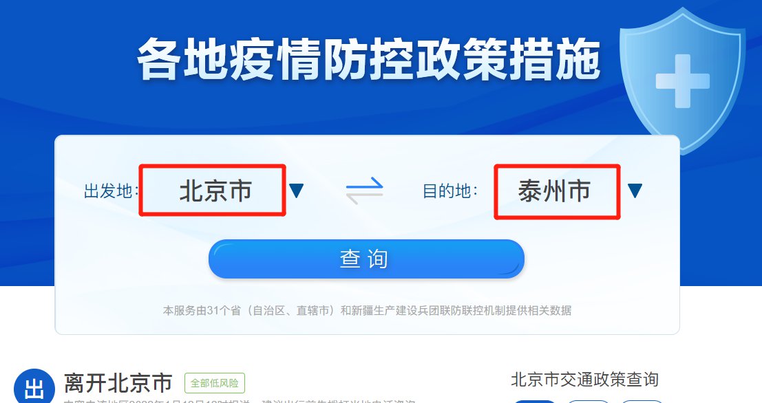 进入后,选择出发地和目的地,例如出发地选择“北京市”-目的地选择“泰州市”,点击查询即可查看出北京,以及到达泰州的疫情帆控政策。