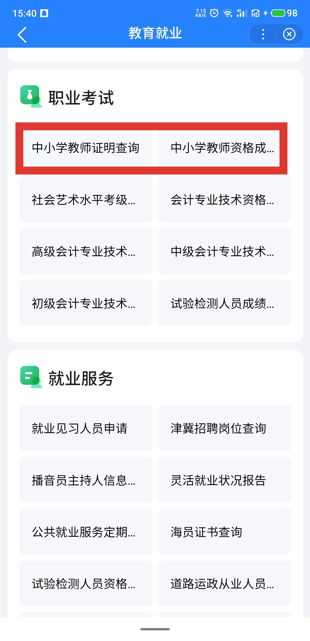 百度搜索『城市服务』小程序,点击进入后点击『教育服务』—『中小学教师资格证明查询』