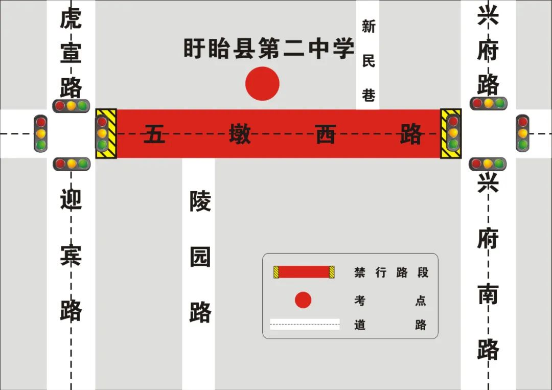 盱眙交警将对兴府路与五墩西路交叉路口、虎宣路与五墩西路交叉路口、陵园路路口、新民巷路口设置交通管理岗点,对第二中学门前路段实行临时交通管制。