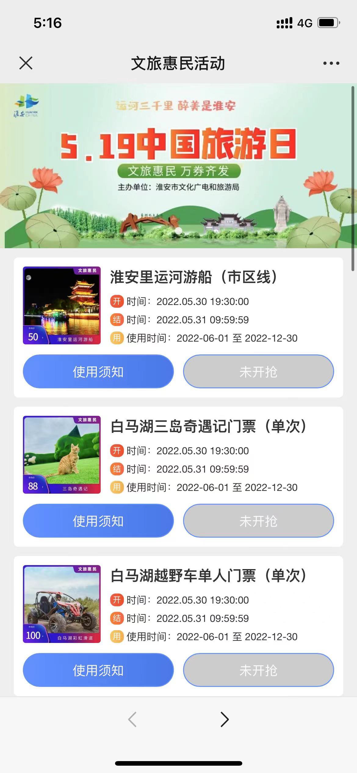 在“文旅淮安”微信公众号对话框内回复:端午,点击链接在指定时间进行抢票。