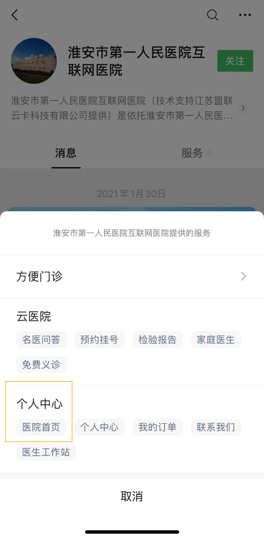 1.搜索关注“淮安市第一人民医院互联网医院”微信公众号;