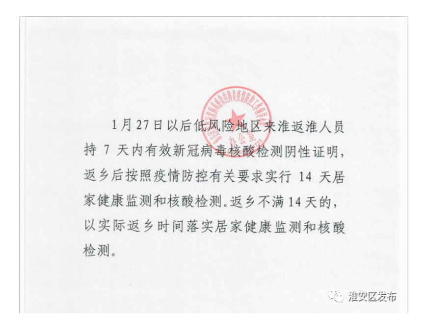 1月27日以后低风险地区来淮返淮人员持7天内有效新冠病毒核酸检测阴性证明,返乡后按照疫情防控有关要求实行14天居家健康监测和核酸检测。返乡不满14天的,以实际返乡时间落实居家健康监测和核酸检测。