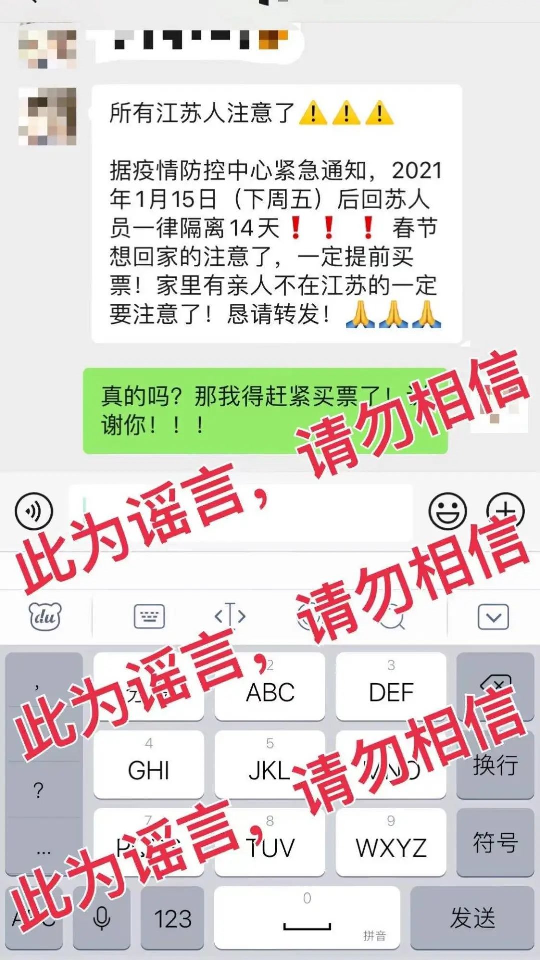 临近春运,疫情防控形势日益严峻,与返乡回程相关的谣言开始出现。日前,就有一条关于来苏返苏人员入苏隔离的信息在微信等社交媒体上传播开来。