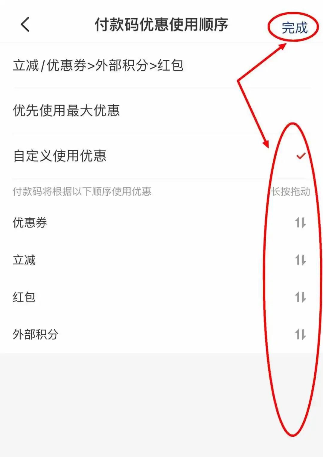 4、选择“自定义使用优惠”,拖动“立减”、“优惠券”、“红包”、“外部积分”选项设置云闪付付款码优惠使用顺序,按“完成”确定。