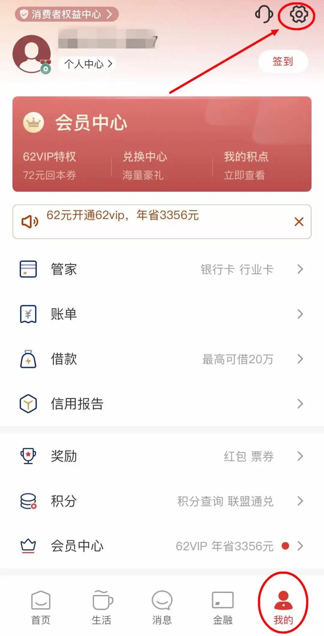 1、登录云闪付APP【我的】,点击【我的】右上角设置图标。