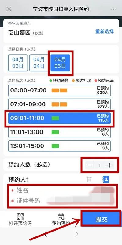 选择你想预约的日期和时间,以及预约人数和预约人详情,填写完毕后点击右下角“提交”即预约成功