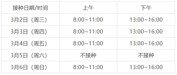 一、接种时间:上午8:00-10:30,下午13:00-16:00