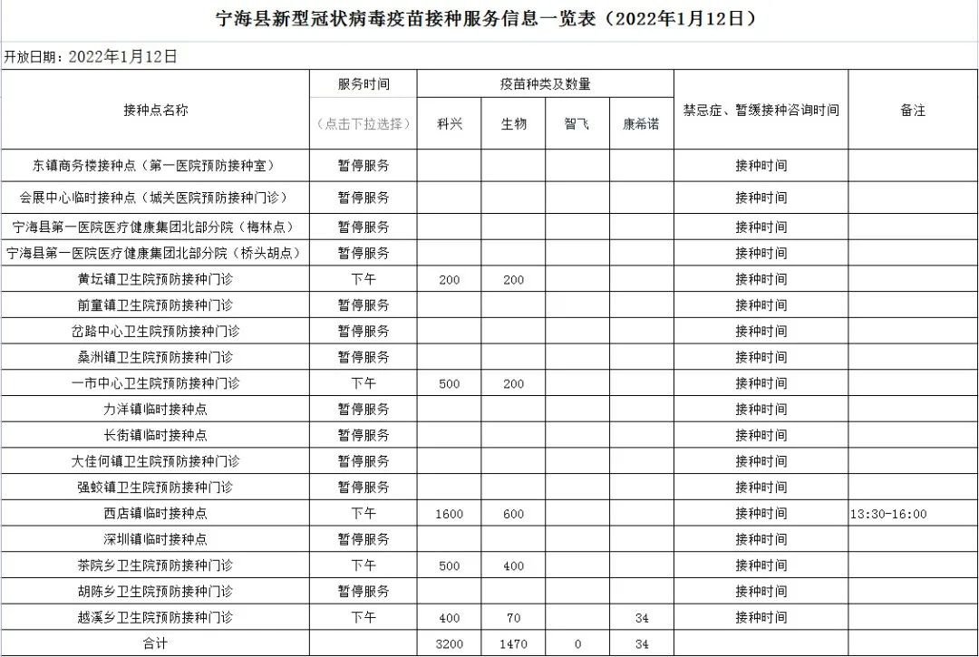 2022年1月12日宁波新冠疫苗接种点开放安排