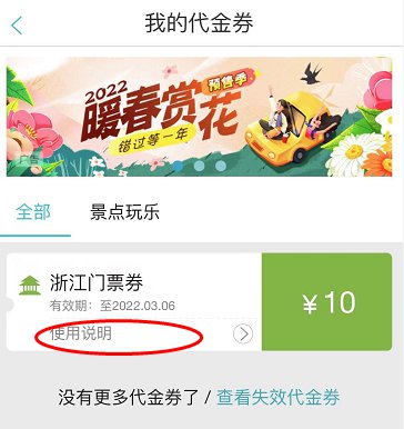 (2)点击“使用说明”可以看到消费券的使用详情,然后点击“立即使用”,在景区名单中搜索浙江省内的景区进行购票即可。(需要满足消费券的满减要求哦)