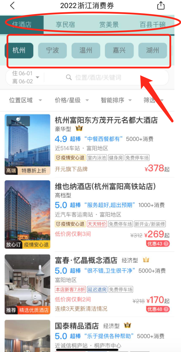浙江旅游消费券平台可用的酒店或者景区名单查询方式: