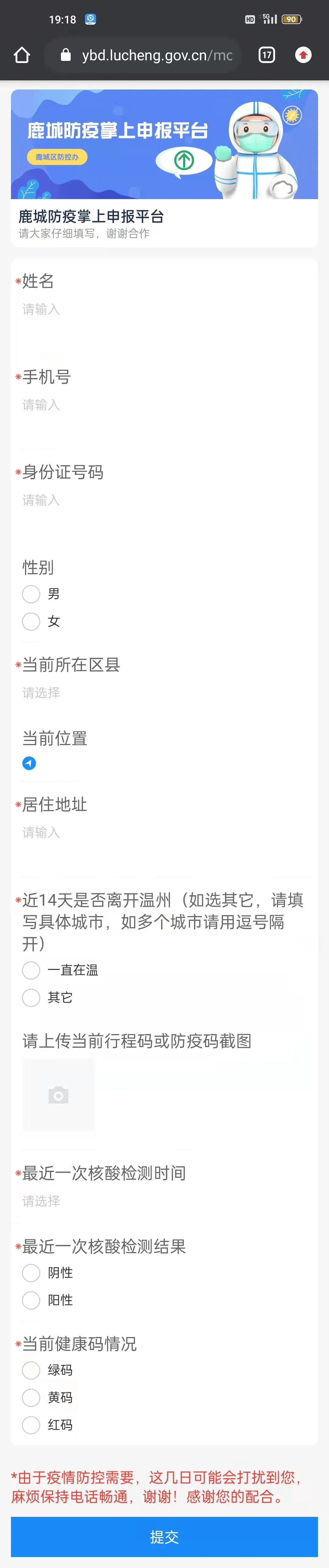 鹿城防疫办提醒:目前,国内疫情防控形势十分严峻复杂,为了避免给您出行带来不便,如您手机里收到来自【鹿城区防控办】的短信(发送号码为106509712071112),请及时登录链接中的“鹿城防疫掌上申报平台”如实填写信息,配合疫情防控工作。