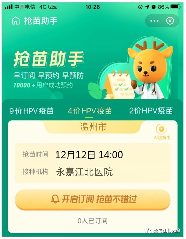 永嘉江北医院九价HPV疫苗将于12月12日14:00在医鹿App平台开放线上预约!本次预约九价HPV疫苗预约名额 50 人份。数量有限,先约先得!以下为预约和接种的详细信息,请务必认真阅读!!!