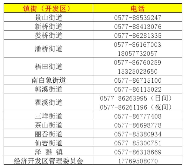 瓯海区各镇街(开发区)报备电话一览表