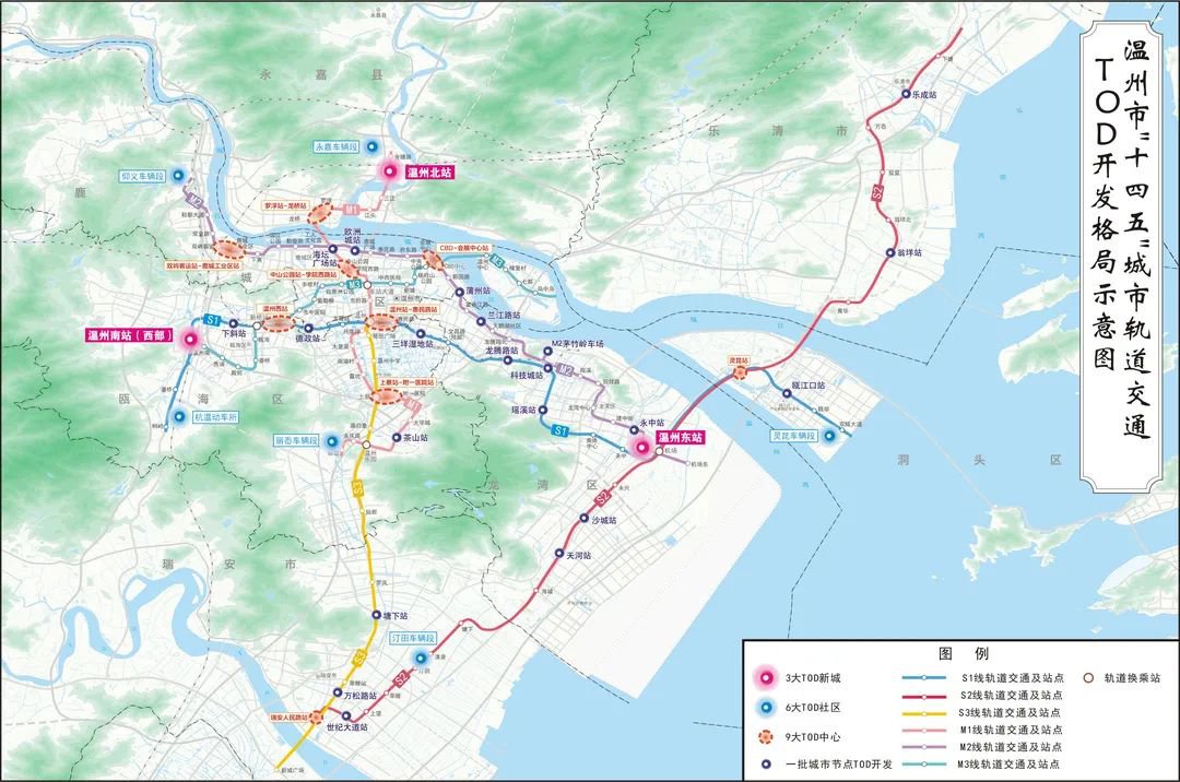 TOD“十四五”规划提出要全面推进温州市轨道交通TOD综合开发,以TOD引领城市空间优化和功能升级,依托规划建设的“S+M”轨道交通网,复合高密推进轨道交通沿线土地综合开发利用。按照整体规划、分期实施的原则,突出人跟线走、集约高效的理念,精心谋划实施沿线站点及车辆段上盖物业、综合体和TOD+未来社区开发,引导集聚人流、培育客流,促进轨道交通与新型城镇化融合发展。