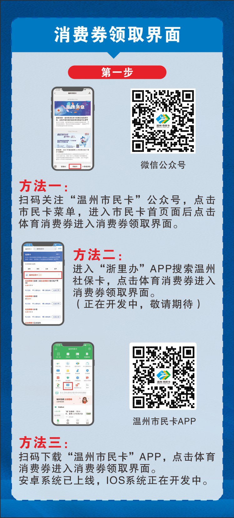 温州市区体育消费券惠民活动9月份开始计划每周发行一次(暂定每周五上午10:00),试运行期间温州市民可以通过“温州市民卡”公众号、“温州市民卡”APP(目前APP仅支持安卓系统,IOS系统正在开发中)进入消费券领取界面,领券成功后可出示消费券二维码或者携带“温州市民卡”实体卡到市区任一家体育消费券定点场所支付核销。后期还将开放“浙里办”APP领券入口,敬请期待。
