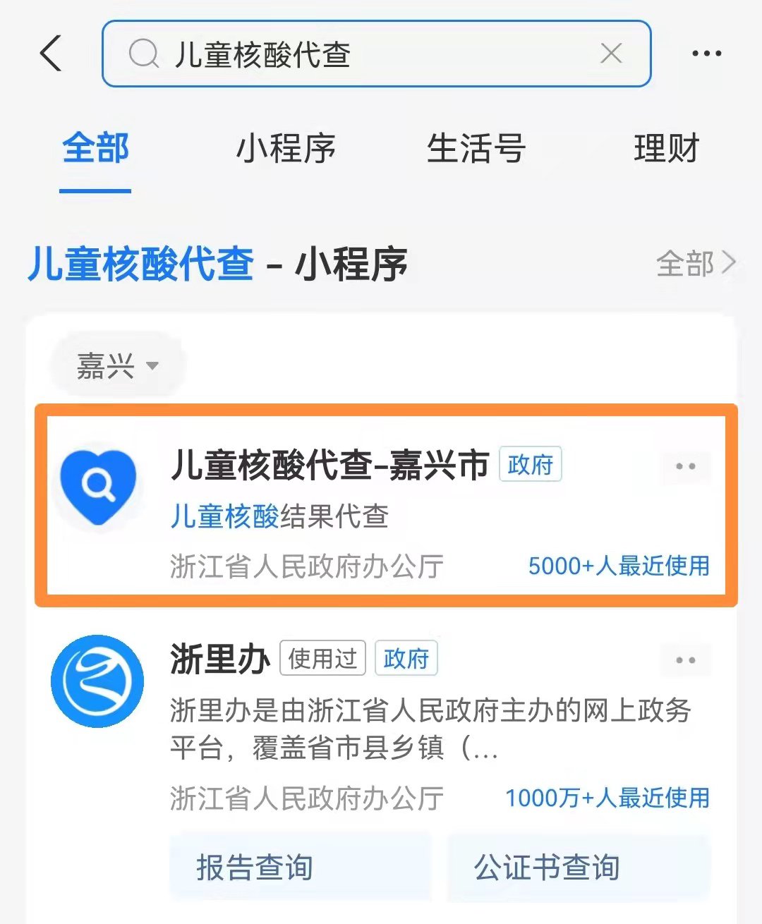 可以在“支付宝”APP搜索中直接输入“儿童核酸代查”,点击“儿童核酸代查-嘉兴市”,输入姓名、身份证号码,即可查询。